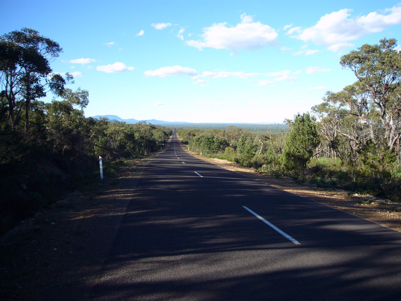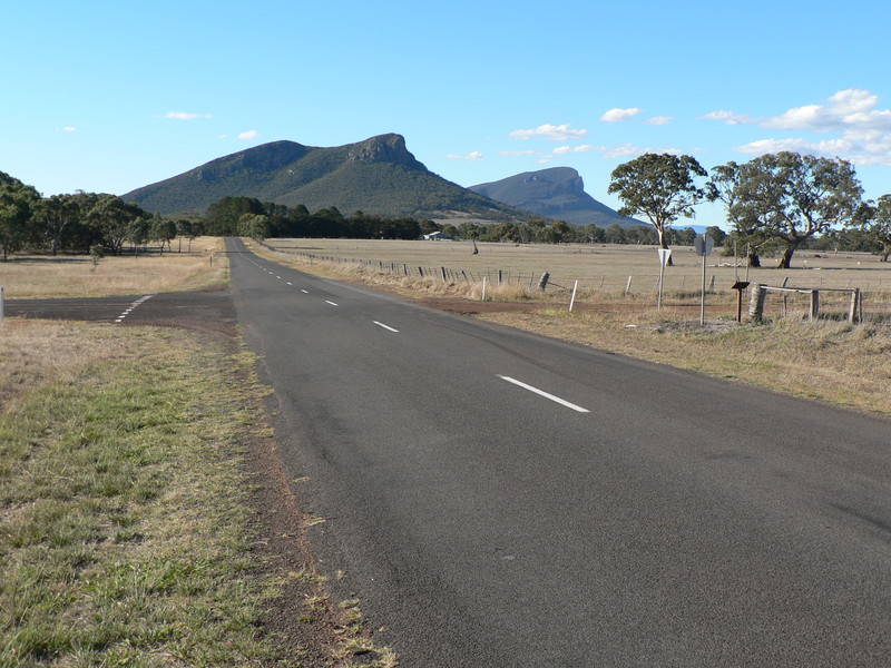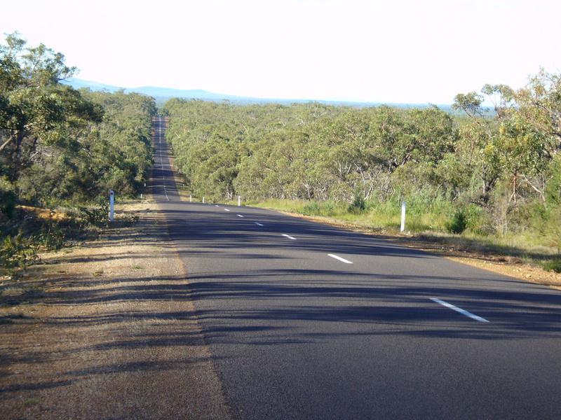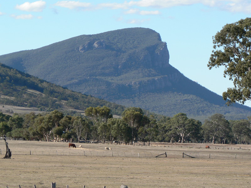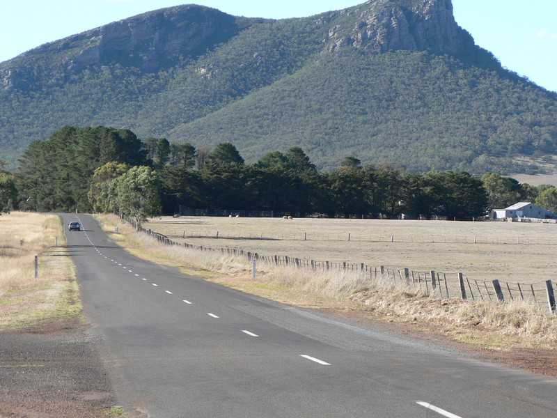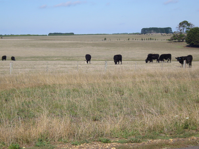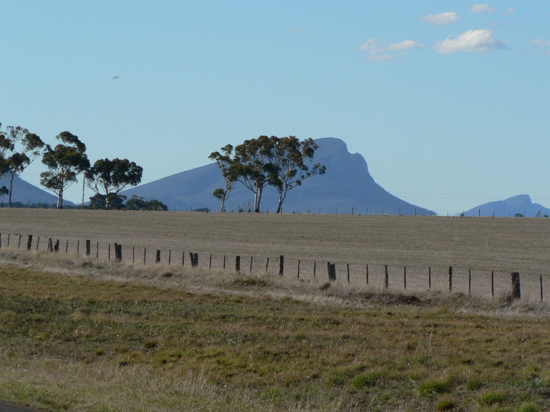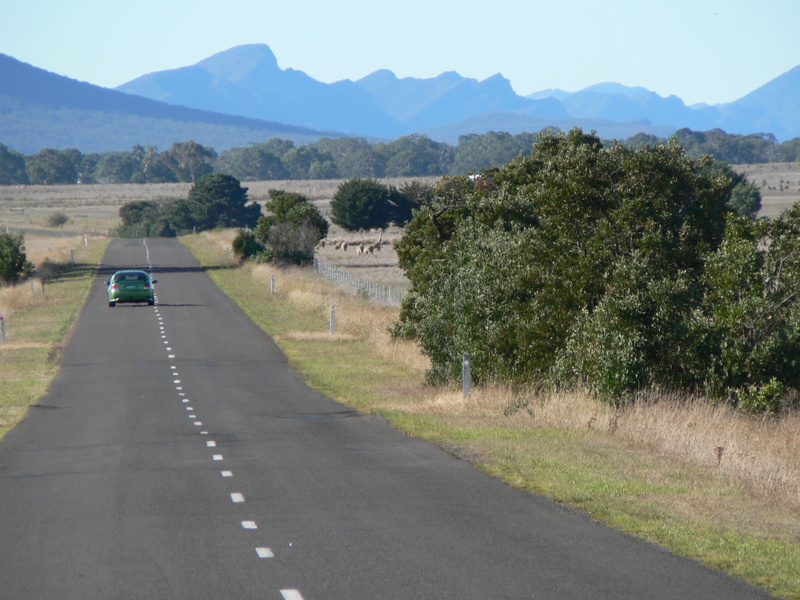 Australien, wie viele Überraschungen hast Du noch für mich übrig? Vorhin hat es noch genieselt bei völlig verhangenem Himmel, jetzt, nachdem ich gerade mal 20 (!) Kilometer ins Landesinnere gefahren bin, nichts mehr von allem. Es klart nicht nur auf, sondern die Wolken sind ad hoc verschwunden. Das Grün der Küste ist auch dahin. Kühe und Schafe müssen sich mit der braunen Weide zufrieden geben. Und zum ersten Mal habe ich Kontakt mit den aufdringlichen Fliegen. Man hat mich davor gewarnt. Das Land wird zunehmend trockener. Und am Horizont zeichnen sich die Grampions ab.