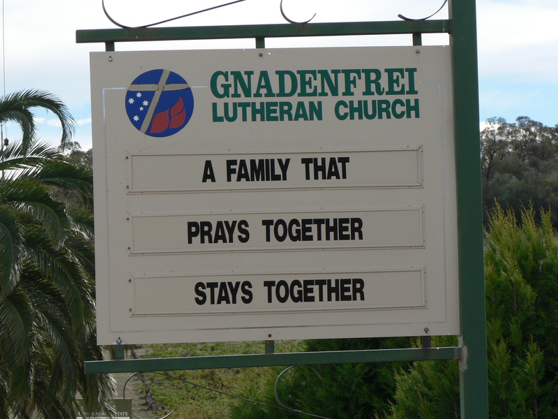 Ja, es gibt einige Hinweise auf deutsche Wurzeln hier. Zuweilen sogar sarkastische. Ich bin Richtung Seppeltsfield unterwegs, da steht sie, rechts am Wegesrand, die Kirche der Lutheraner. Der eiserne Torbogen erinnert mich spontan und unweigerlich an das dunkelste deutsche Kapitel. „Arbeit macht frei“, so steht in ähnlicher Weise über dem Toreingang im KZ Auschwitz. Und jetzt „Gnadenfrei“. Ich verweigere meinem Verstand jeglichen inhaltlichen Vergleich. Wir sind hier in Australien – trete ich zu mir selbst in Gegenrede – und nicht in einem Nazi-Nest irgendwo in Deutschland. Es sollte aber anders kommen.