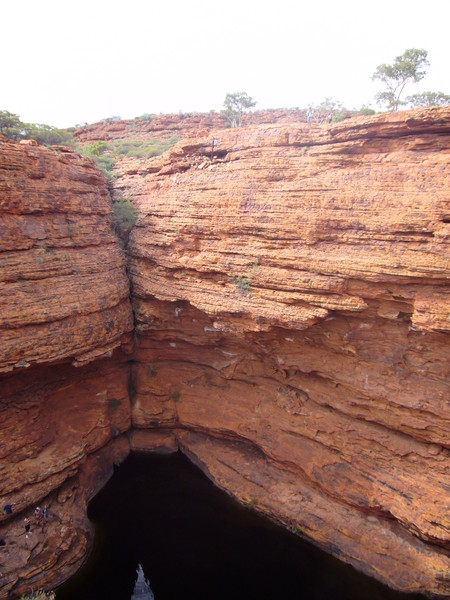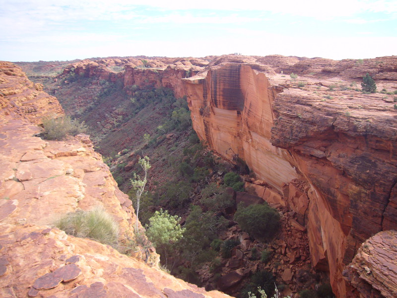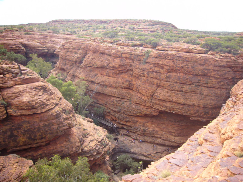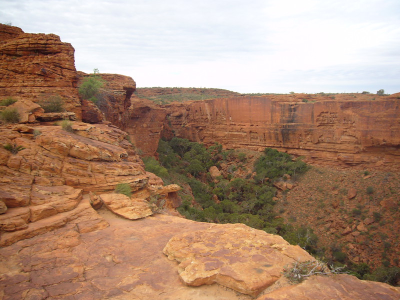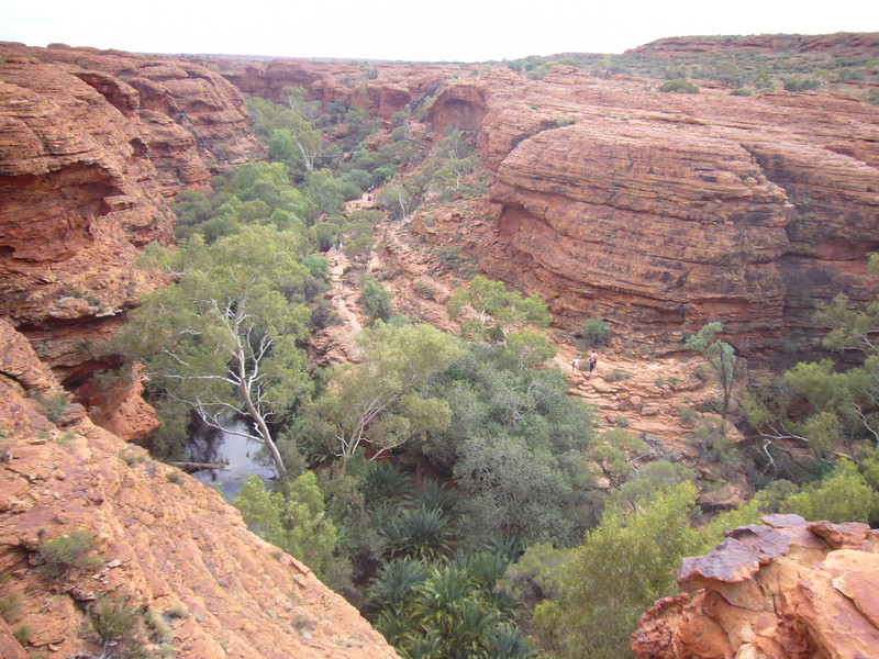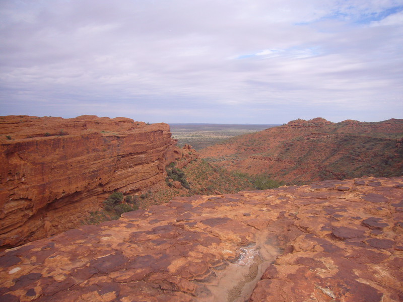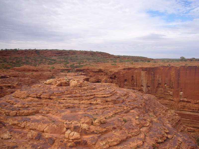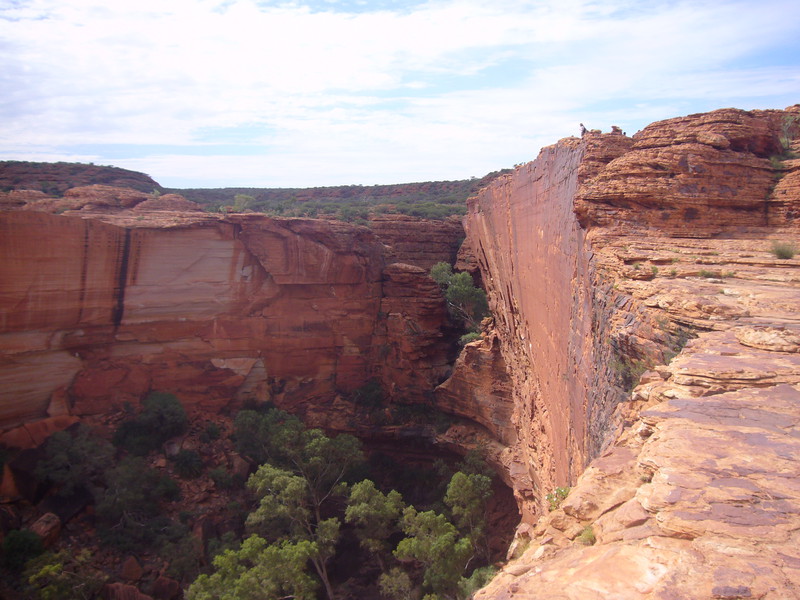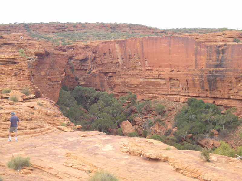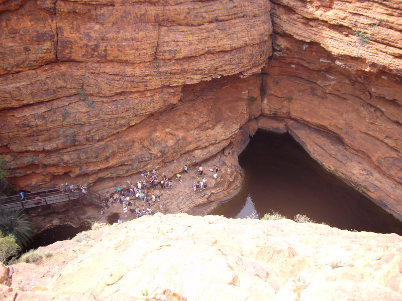 Gestern hatten wir einen herrlichen Blödel-Abend, aber wir waren noch ernst genug, uns für den heutigen Tag dem Kings Canyon zu verpflichten. Das heißt, es wird ein bisschen anstrengend. Denn, um von oben in den Canyon hineinzublicken, muss man erst nach oben. Die Felsformation, die man sieht, ist also sozusagen der Topf – und der Canyon sein Inhalt. Wer sich weniger anstrengen will, der bleibt unten, und durchläuft den Boden der Schlucht. Das kann man in einer Stunde erledigen.