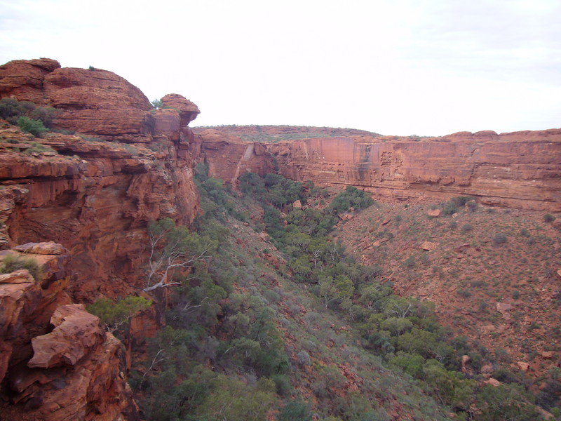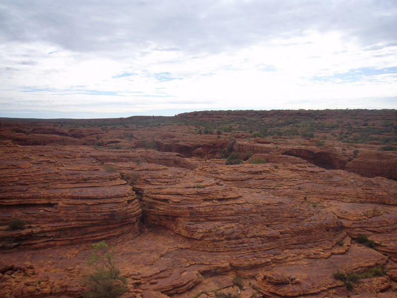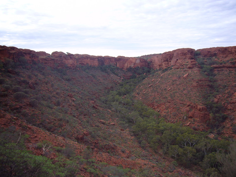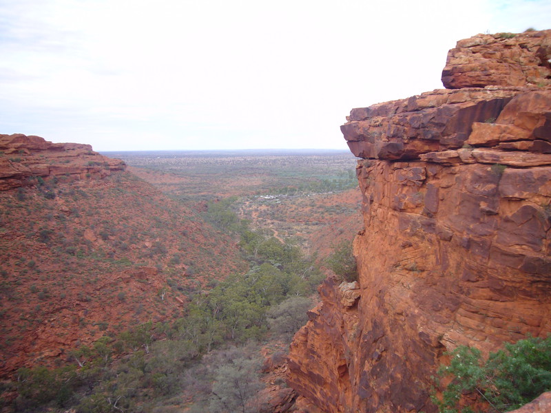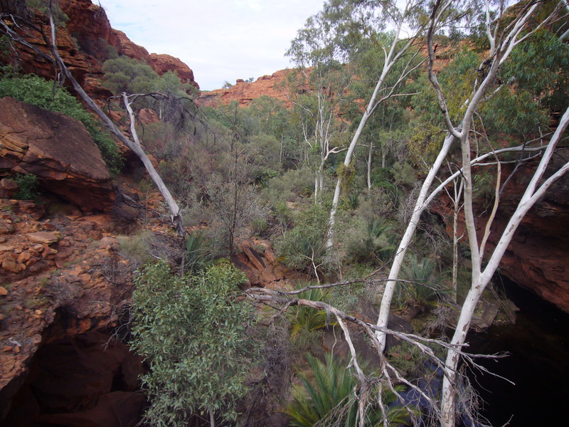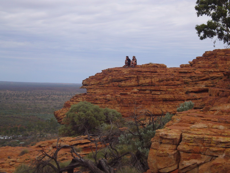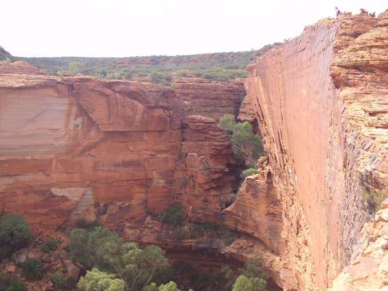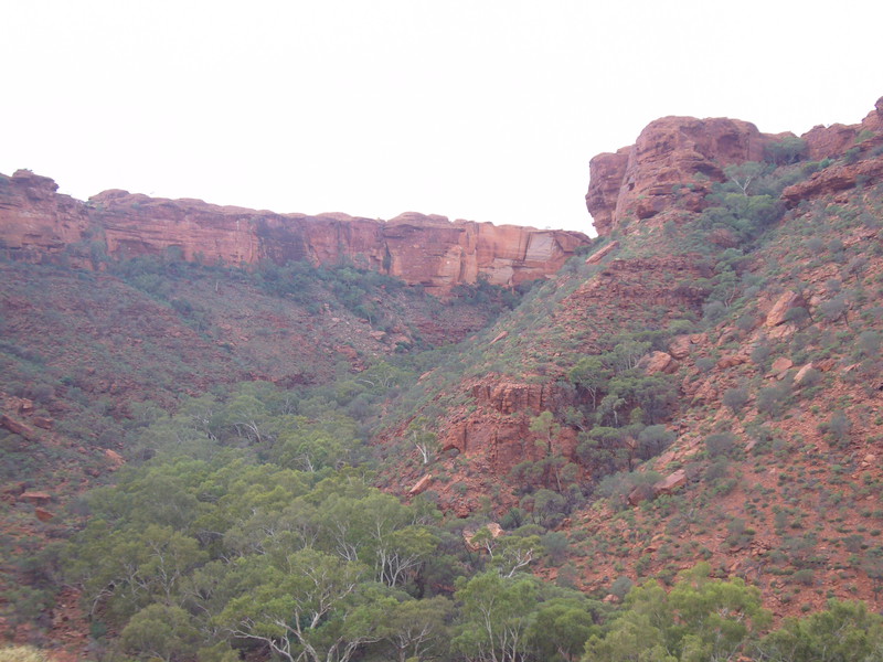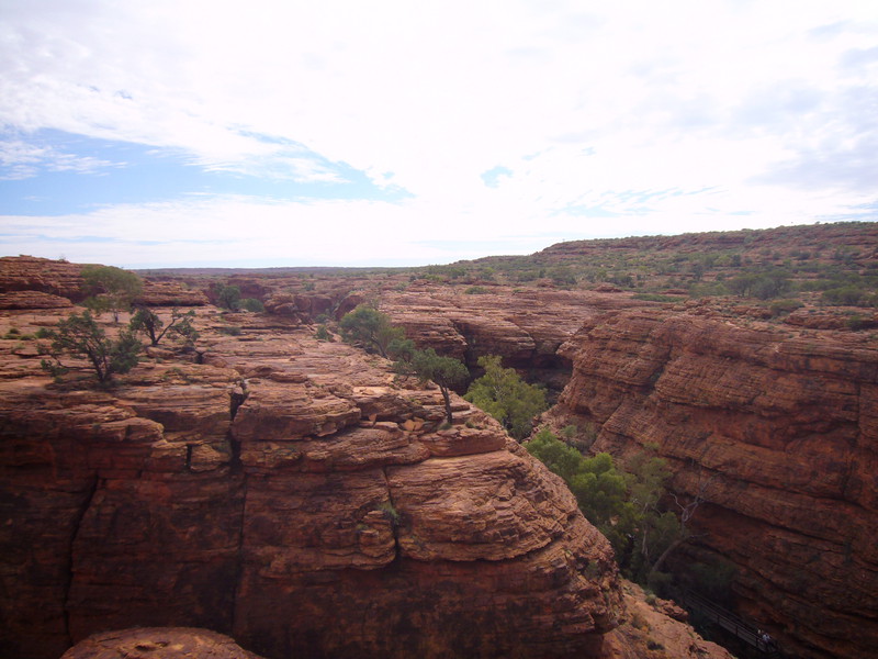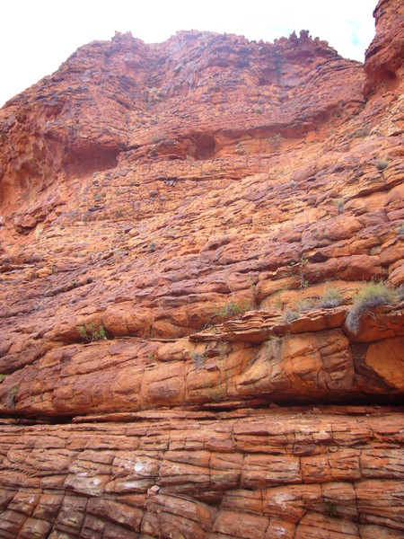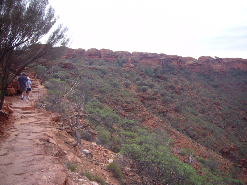 Gestern hatten wir einen herrlichen Blödel-Abend, aber wir waren noch ernst genug, uns für den heutigen Tag dem Kings Canyon zu verpflichten. Das heißt, es wird ein bisschen anstrengend. Denn, um von oben in den Canyon hineinzublicken, muss man erst nach oben. Die Felsformation, die man sieht, ist also sozusagen der Topf – und der Canyon sein Inhalt. Wer sich weniger anstrengen will, der bleibt unten, und durchläuft den Boden der Schlucht. Das kann man in einer Stunde erledigen.