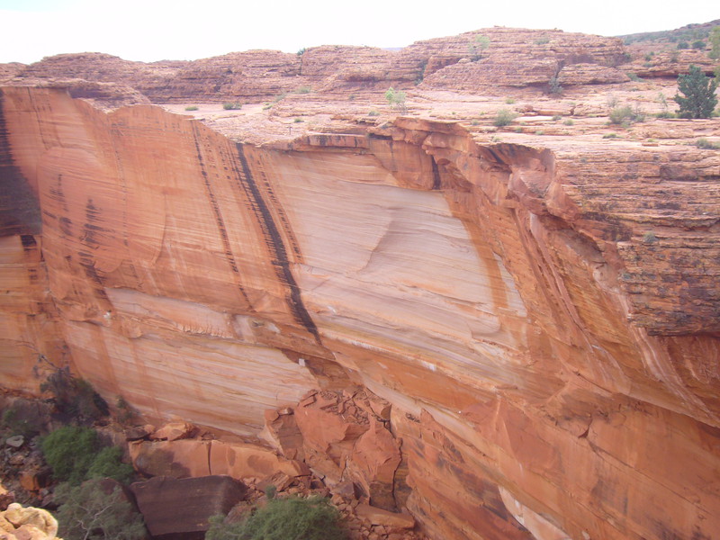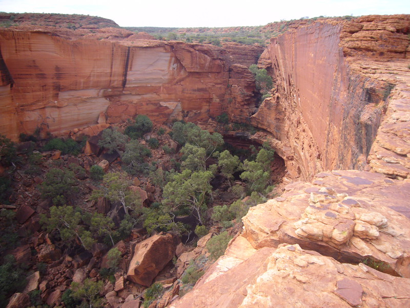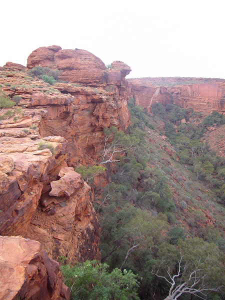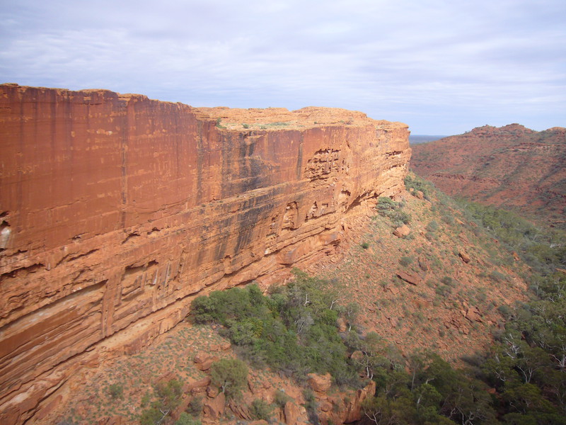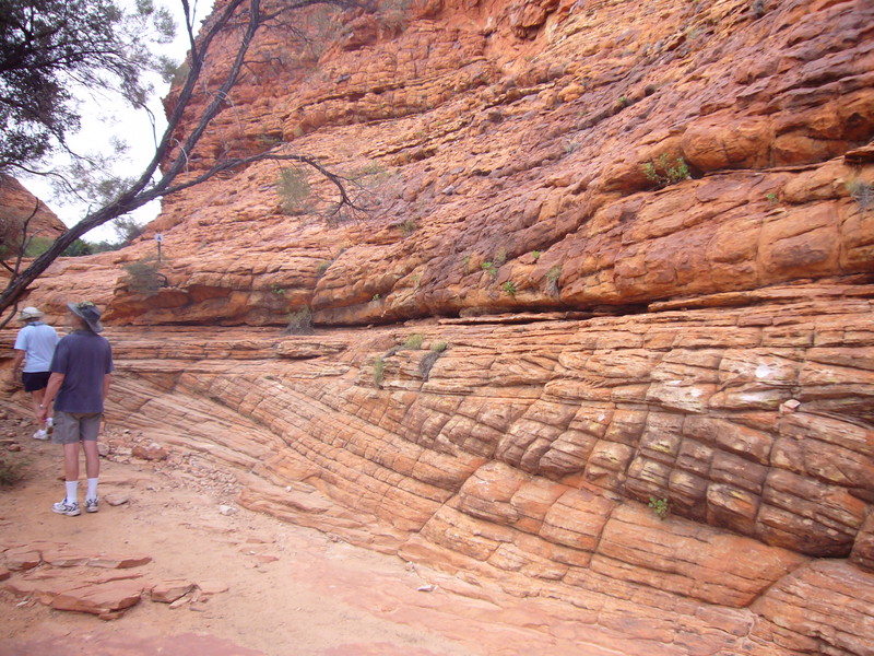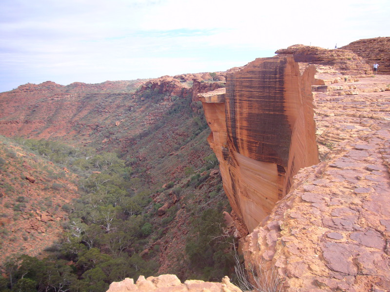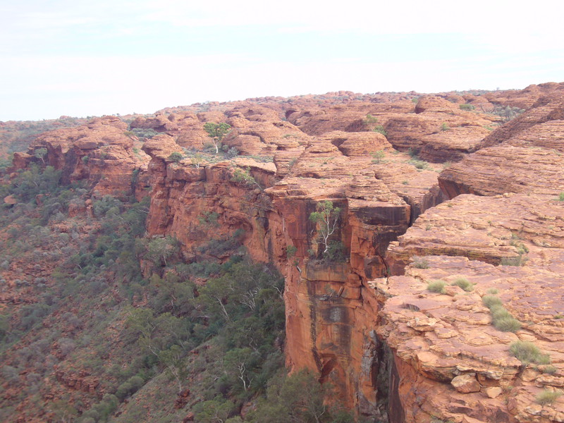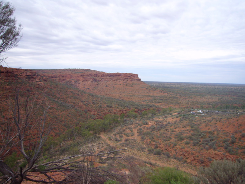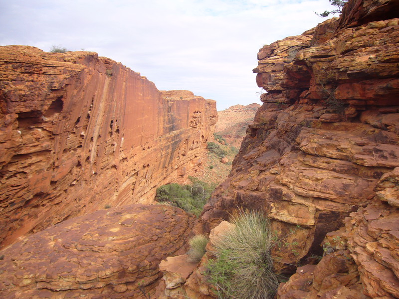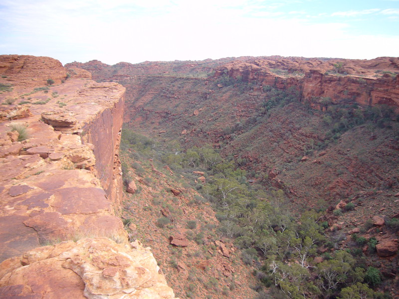 Gestern hatten wir einen herrlichen Blödel-Abend, aber wir waren noch ernst genug, uns für den heutigen Tag dem Kings Canyon zu verpflichten. Das heißt, es wird ein bisschen anstrengend. Denn, um von oben in den Canyon hineinzublicken, muss man erst nach oben. Die Felsformation, die man sieht, ist also sozusagen der Topf – und der Canyon sein Inhalt. Wer sich weniger anstrengen will, der bleibt unten, und durchläuft den Boden der Schlucht. Das kann man in einer Stunde erledigen.