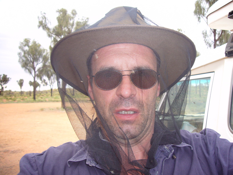 Zum Glück habe ich mir in Coober Pedy dieses ziemlich bescheuert aussehende Fliegennetz für den Kopf gekauft. Ohne das Teil wäre an ein Bleiben gar nicht zu denken. Wer es noch nicht erlebt hat, wird es sich kaum vorstellen können. Ständig – und ständig heißt: zu jeder Sekunde – krabbelt eines dieser Tiere in Ohren, Nase Mund und Augen. Der Wahnsinn ist somit sicher. Mit dem Netz über Hut und Kopf ist es erträglich, aber Essen ist nicht. Ich muss zum Essen ins Auto! Unglaublich. So wie es aussieht, kann ich das Frühstück morgen vergessen. Inzwischen wird es dunkel, aber die Plage bleibt immer noch in meiner Nähe. Und, es sind ein paar Regentropfen gefallen, nachdem es heute den ganzen Tag über bewölkt war. Schätze, morgen früh haben wir wieder blauen Himmel.