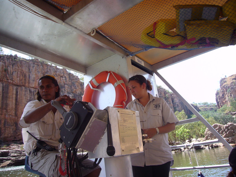 Wir treffen uns zum Frühstück um halb acht im Visitor Center. Clive ist ein Macher. Unaufdringlich aber bestimmt managt er die Dinge. Um 11 hat er mich aufs Ausflugsboot durch die Katherine Gorge gebucht, um 14 Uhr auf den Helikopter. Ausflugsboot klingt furchtbar nach spießiger Touristenveranstaltung. Ist es auch. Aber die flachen Aluminiumboote sind ist eine gute Möglichkeit, sich aufs Wasser und die Landschaft zu konzentrieren. Wer will, kann auch Kanus leihen. Ich bin mit dem „Wassertaxi“ aber äußerst zufrieden. Die Perspektiven sind großartig.