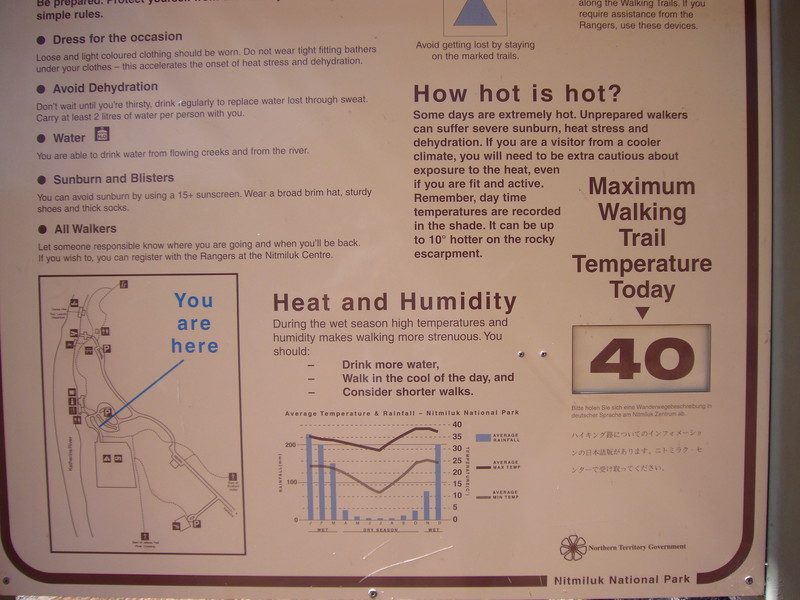 Tja, so kann es gehen. Werner in Katherine hat mich an Clive im Nitmiluk-Nationalpark weitergereicht, Clive hat auch schon wieder eine Adresse für mich. Einerseits ist es sicherlich ihr Geschäft, auf der anderen Seite helfen sie gerne. Vielleicht ist letzteres aber auch nur Einbildung. Ich glaube aber, eher nicht.