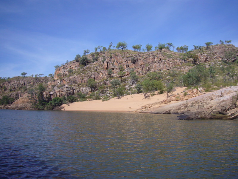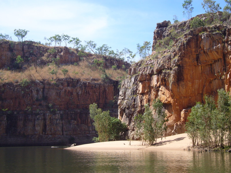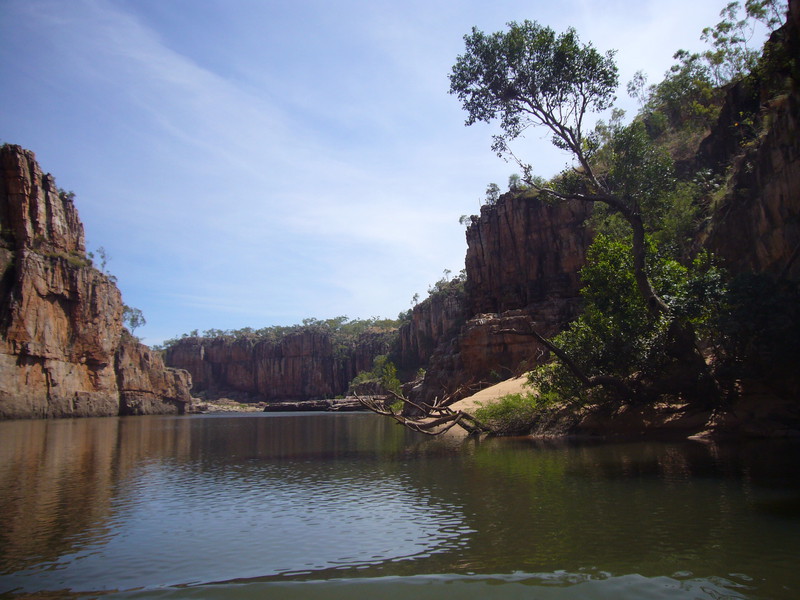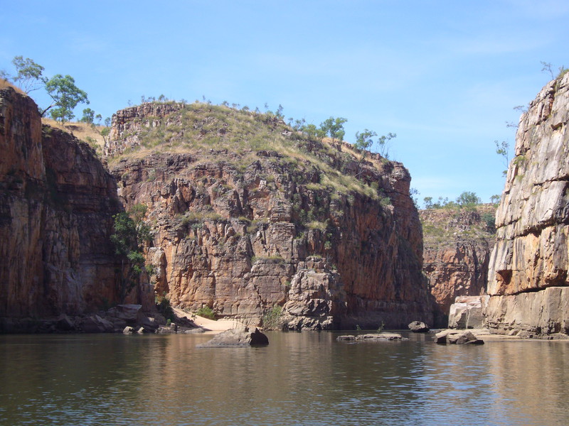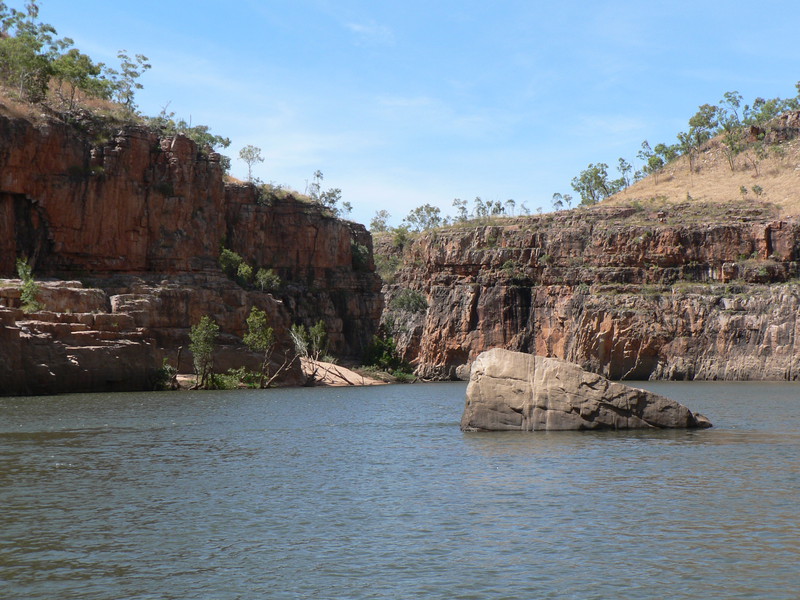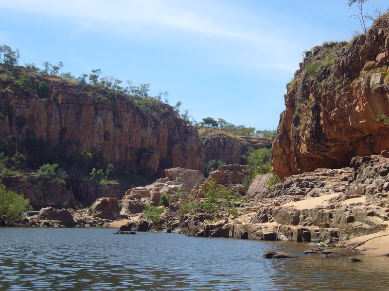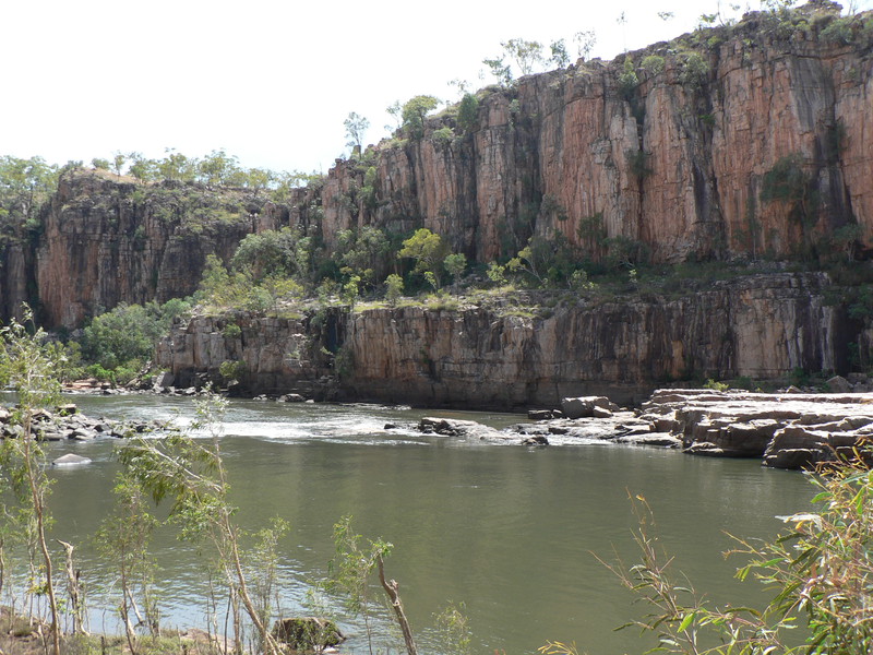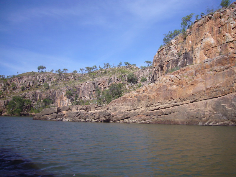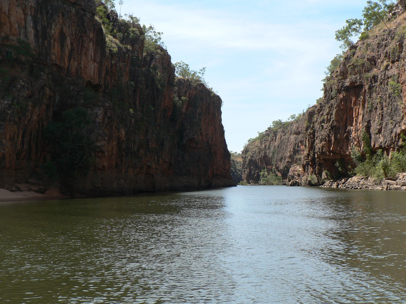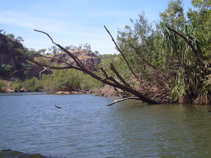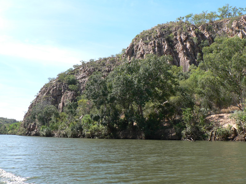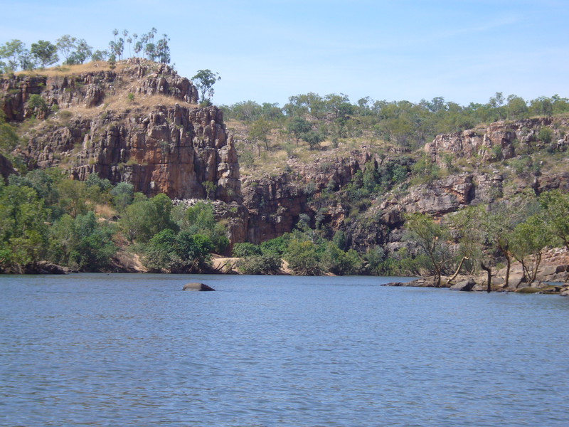 Irgendwann schaltet das Boot auf dem Katherine River den Elektromotor ab. „Da hinten am Ufer“, macht uns der Guide aufmerksam. „Direkt am Baum vorm Gras.“ Es dauert eine Weile, aber dann ist es auch mit dem bloßen Auge zu erkennen – wahrscheinlich ein Süßwasserkrokodil, ein harmloser Fischfresser. Im Gegensatz zum gefährlichen Salzwasserkrokodil an der schmalen und längeren Schnauze zu erkennen. Das Zoom der Kamera holt den Burschen näher ran. Hmmm, ist die Schnauze wirklich lang und schmal? Zumal bekannt ist, dass bei Hochwasser auch Salzwasserkrokodile weit flussaufwärts eindringen können. Aber die Hochwassersaison ist ja vorbei. Es geht weiter flussaufwärts. Weiter durch die Katherine Schlucht. An dem Bild hätte Karl May seine Freude gehabt. Hin und wieder hört man Wasser von den Felsen plätschern, die Vögel tragen den Rest zur eigenen Atmosphäre mit der „felswandverstärketen“ Akustik bei. Zwei Stunden verbringen wir auf dem Katherine River.