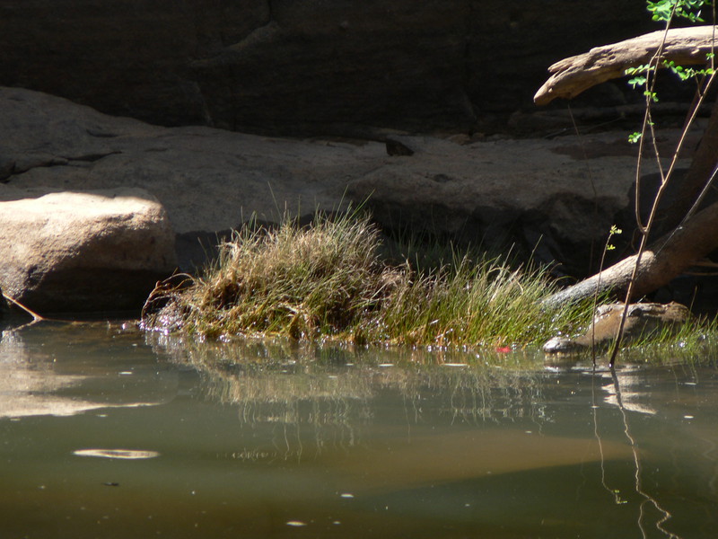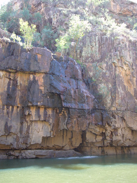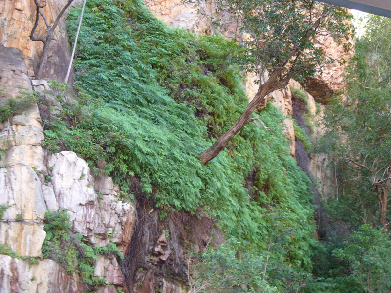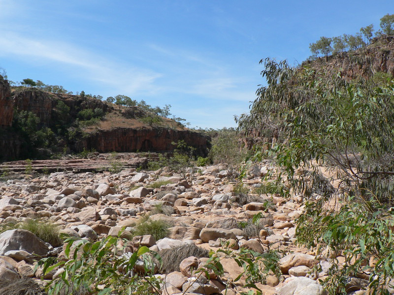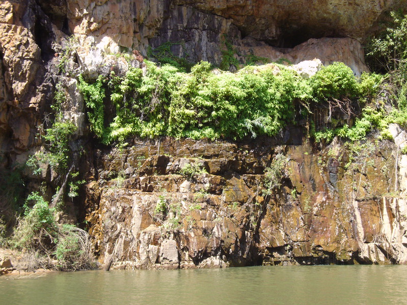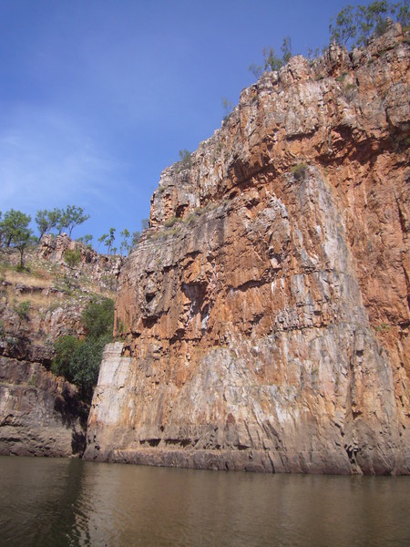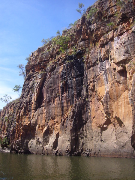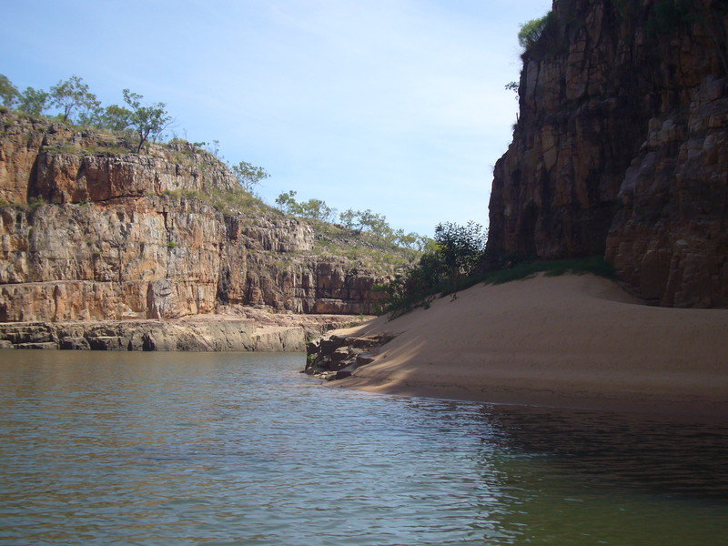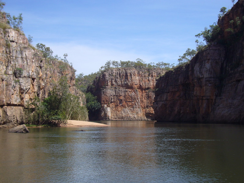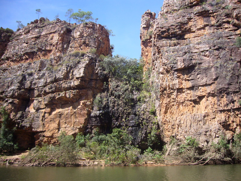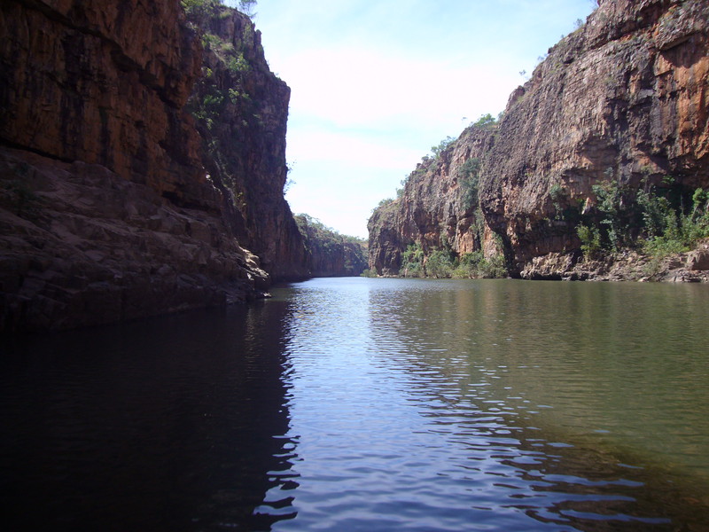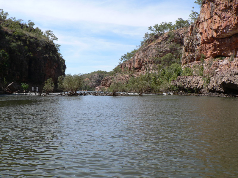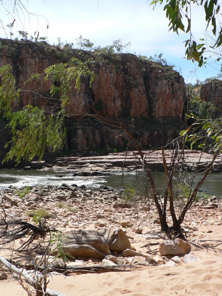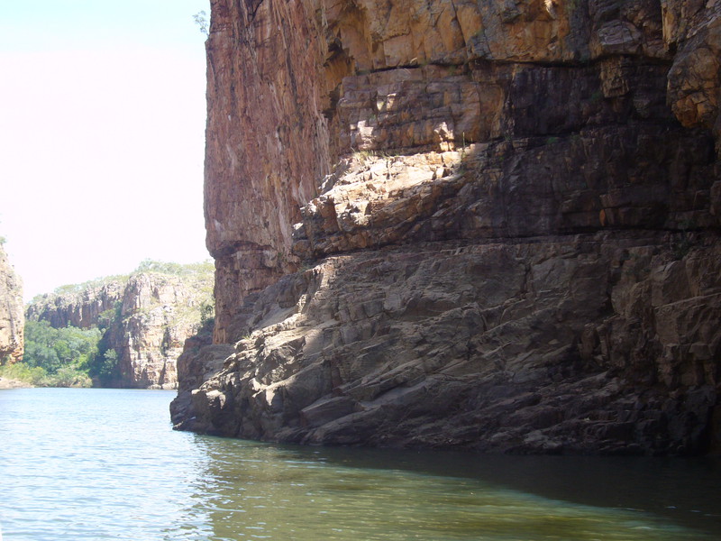 Irgendwann schaltet das Boot auf dem Katherine River den Elektromotor ab. „Da hinten am Ufer“, macht uns der Guide aufmerksam. „Direkt am Baum vorm Gras.“ Es dauert eine Weile, aber dann ist es auch mit dem bloßen Auge zu erkennen – wahrscheinlich ein Süßwasserkrokodil, ein harmloser Fischfresser. Im Gegensatz zum gefährlichen Salzwasserkrokodil an der schmalen und längeren Schnauze zu erkennen. Das Zoom der Kamera holt den Burschen näher ran. Hmmm, ist die Schnauze wirklich lang und schmal? Zumal bekannt ist, dass bei Hochwasser auch Salzwasserkrokodile weit flussaufwärts eindringen können. Aber die Hochwassersaison ist ja vorbei. Es geht weiter flussaufwärts. Weiter durch die Katherine Schlucht. An dem Bild hätte Karl May seine Freude gehabt. Hin und wieder hört man Wasser von den Felsen plätschern, die Vögel tragen den Rest zur eigenen Atmosphäre mit der „felswandverstärketen“ Akustik bei. Zwei Stunden verbringen wir auf dem Katherine River.